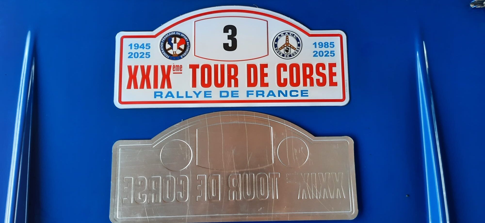 Plaque aluminium commémoration victoire de la R5 maxi Turbo de Jean Ragnotti au Tour de Corse et de ses 80 ans.